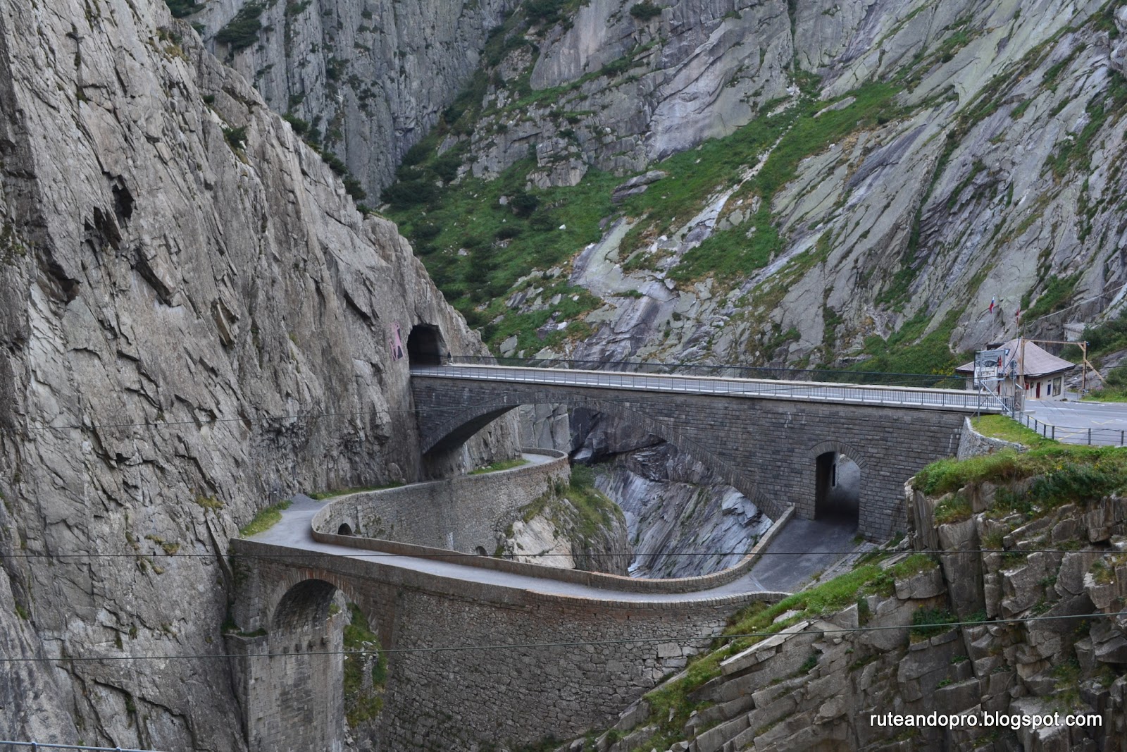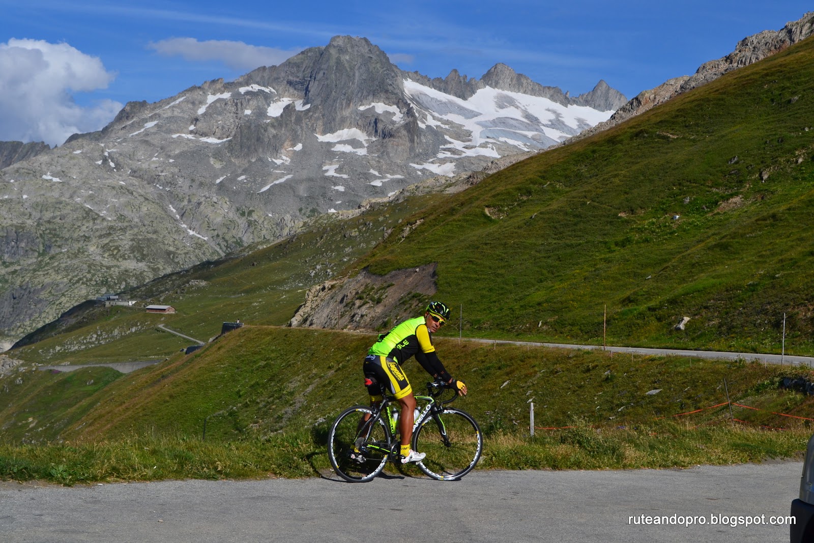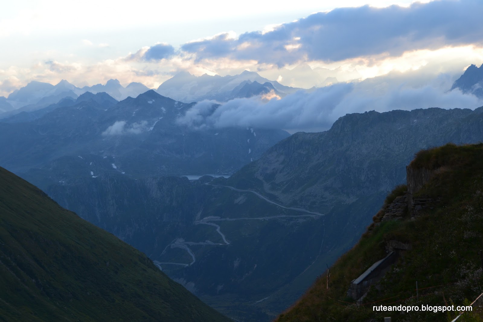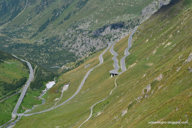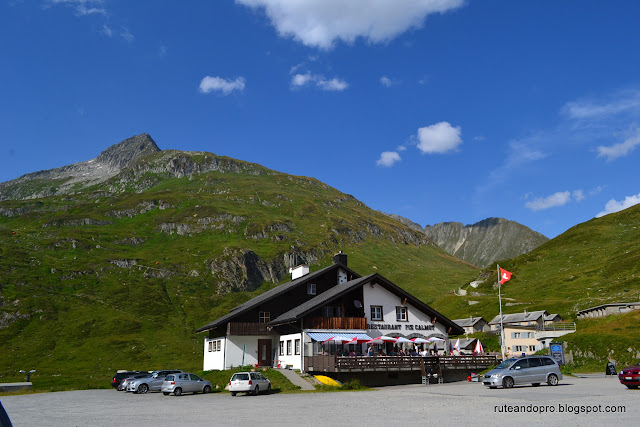 Por la noche ha estado lloviendo, pero por la mañana la lluvia nos va a dar una tregua, como la idea de hoy es salir en bici, no tenemos prisa para levantarnos y se nos pegan las sabanas, nos hemos levantado a las 09.00 horas, tarde para lo que acostumbramos. Mientras desasayumos, Paco y Carmen salen de su Ac, dispuesto a realizar una ruta de senderismo. Las nubes se van compactando, pero estoy decidido a salir en bici. La ruta de hoy empiza bajando el puerto de Oberalpass hasta Andermatt, para subir el paso del St. Gottardo, en esta subida los ulimos 4 km se realiza por carretera de adoquines, un poco incomoda pero le da su singularidad. También se puede subir por la carretera general, pero he preferido conocer esta carretera adoquinada, marcada como ruta de bici de carretera 32. Al llegar al puerto, lo típico, foto y reconocimiento de la zona.