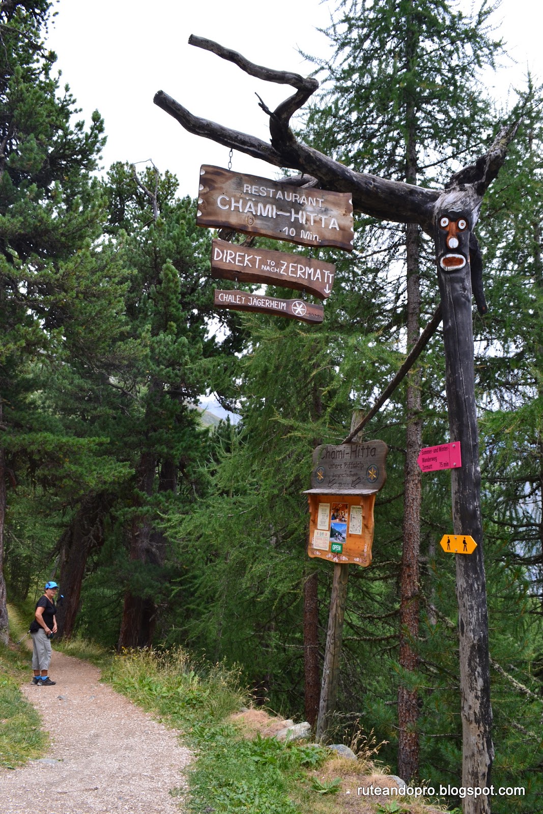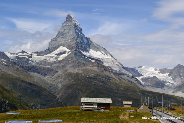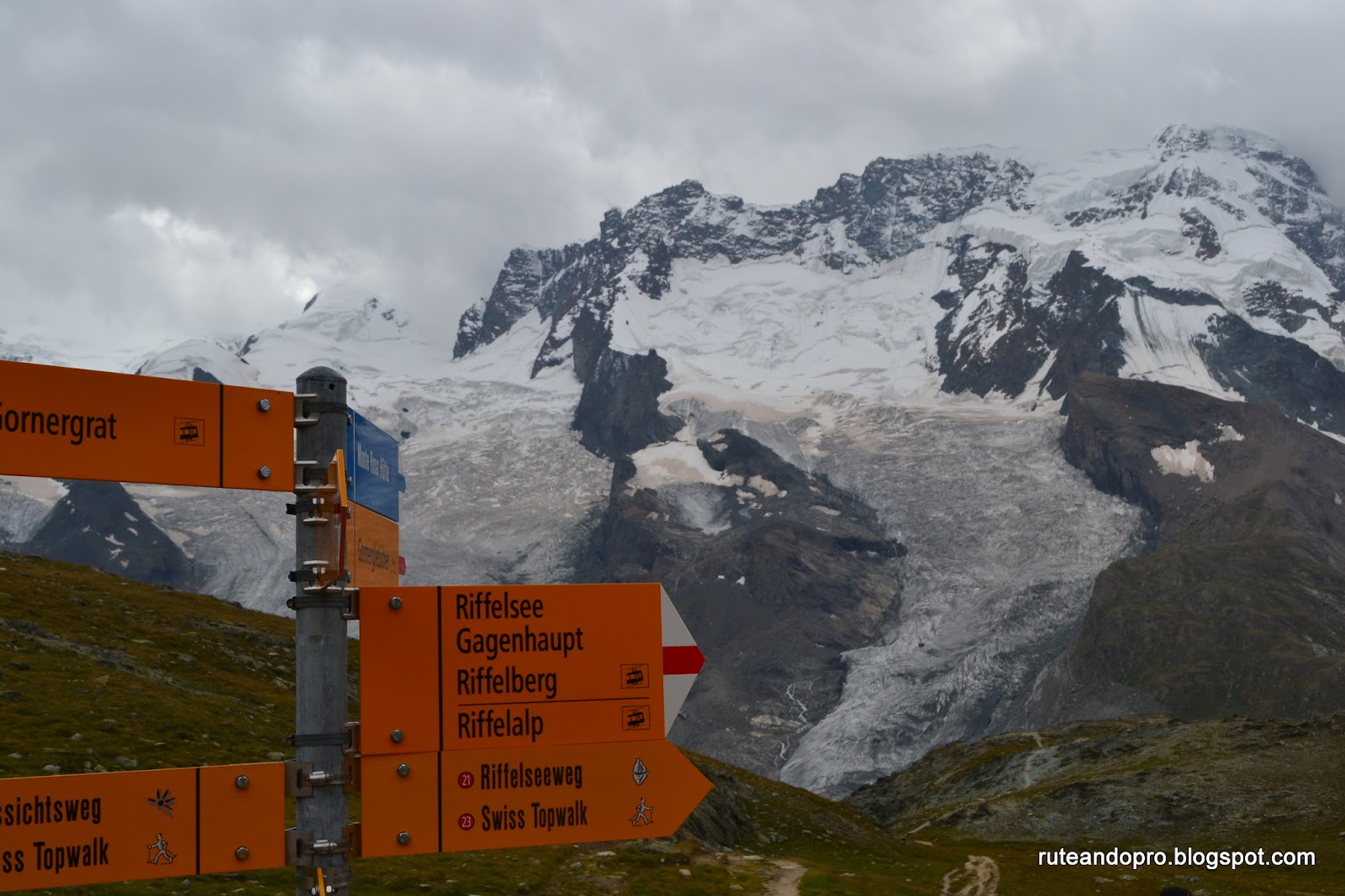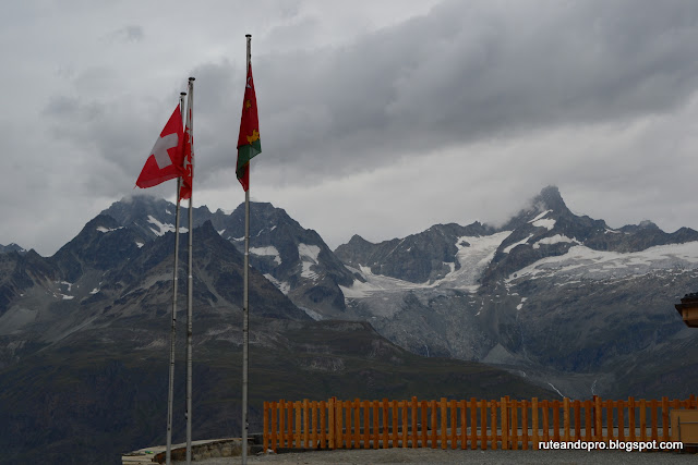 La ruta de bajada que hacemos va pasando por los distintas paradas del tren . Para mas delatalles en Wikiloc. El dia se arruga y empieza a llover, aunque muy suave. Cuando llegamos a Zermatt se pone a llover mas seriamente, esta vez nos ha cogido sin ropa de agua , así que nos ponemos como una sopa, al rato deja de llover y sale el sol, nos secamos rápidamente así que paseo por Zermatt con almuerzo incluido.