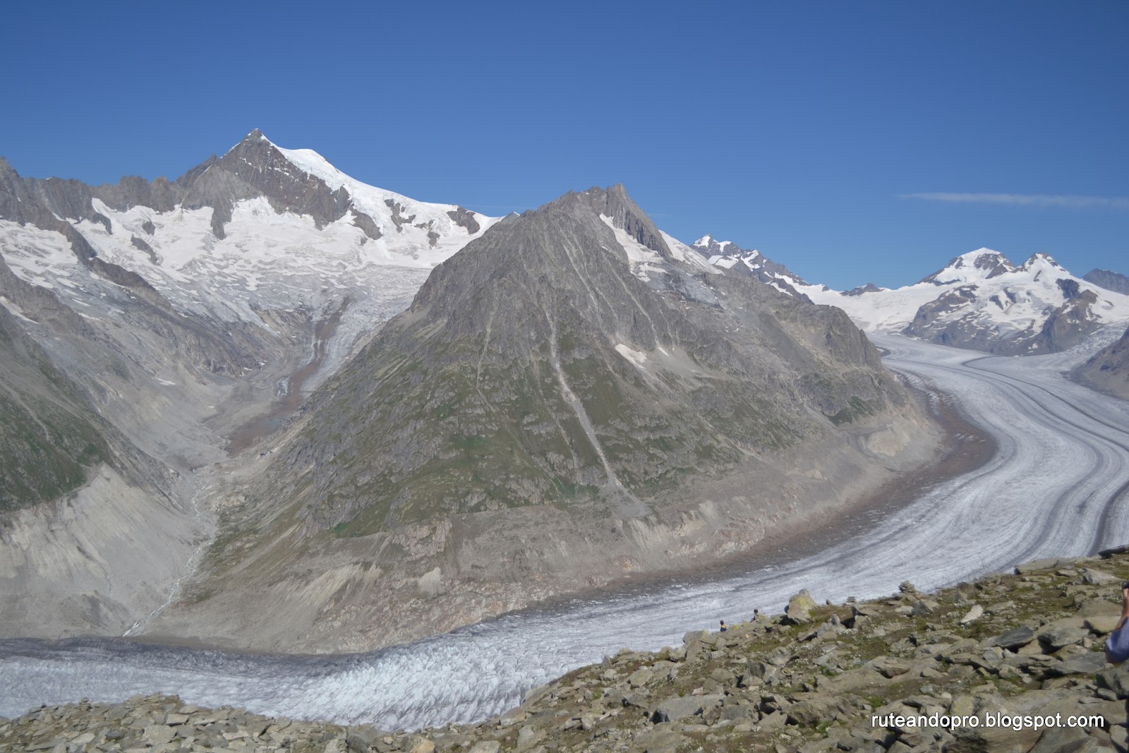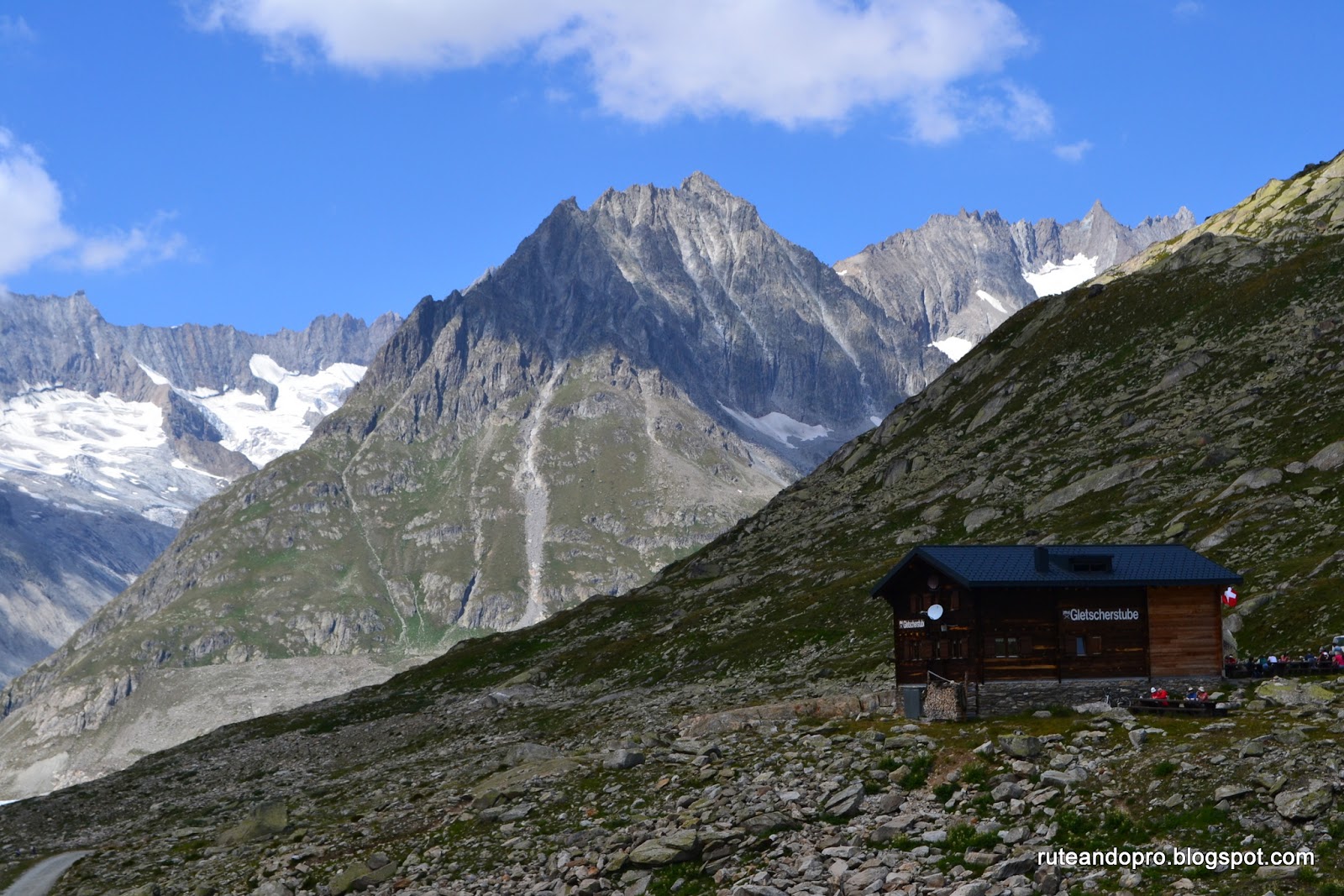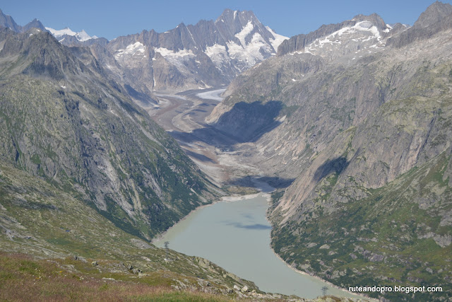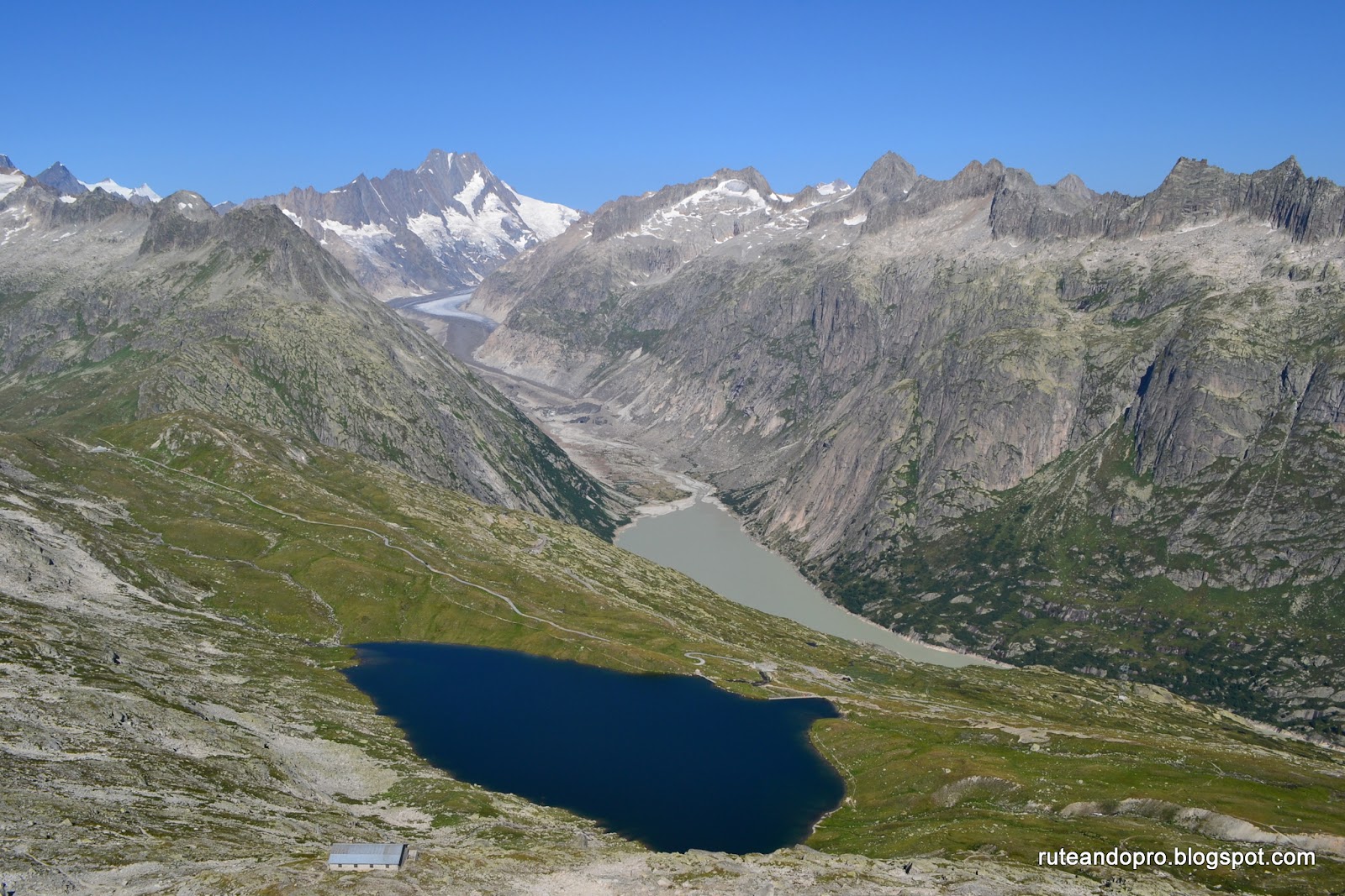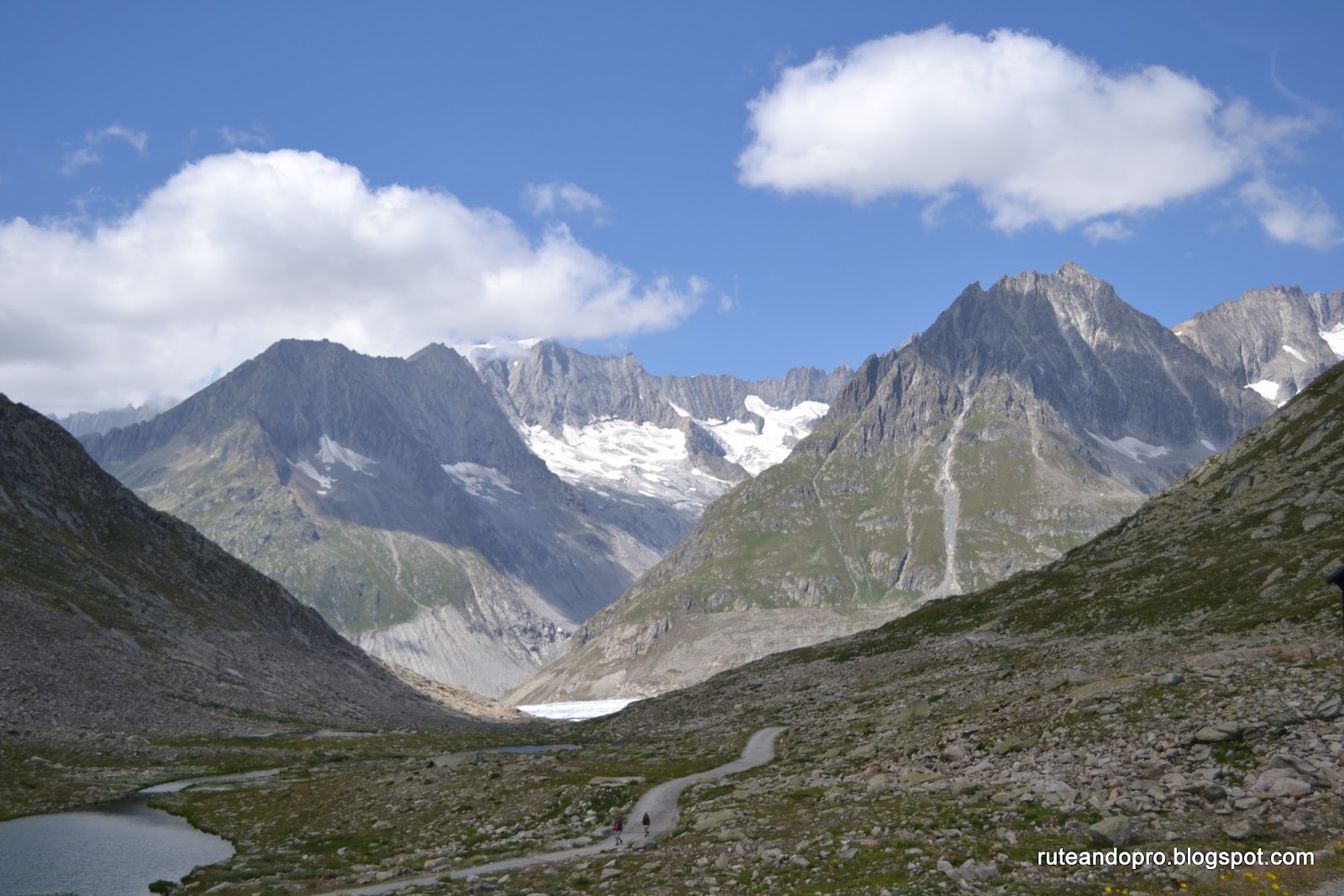 Al final la ruta que optamos para el regreso baja el lago Marjelennsee y al refugio Glestsherstube, desde allí pasamos por un tunel llegamos hasta Fiescheralp para tomar el remonte de bajada.