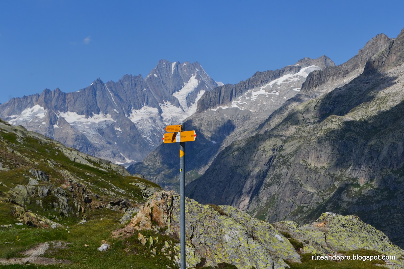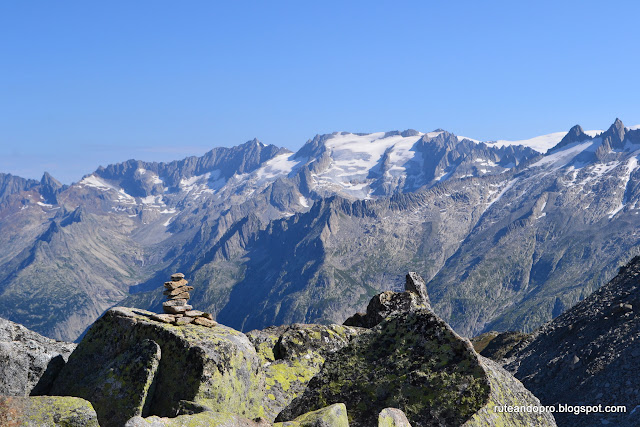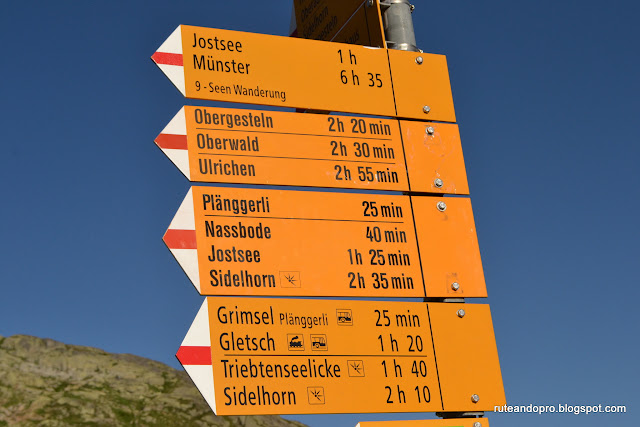 Hemos dormido en el puerto Grimselpass, con unas vistas impresionantes sobre el valle. Nos levantamos a las 7.00 horas, día está radiante, seguramente hará calor. Salimos para realizar una ruta tomando el sendero Oberwald que está marcado en 2'30 horas, continuamos subiendo el Bergaus Oberaar. La ruta nos ha salido circular, con dos subidas a picos y unas panorámicas para no olvidar.