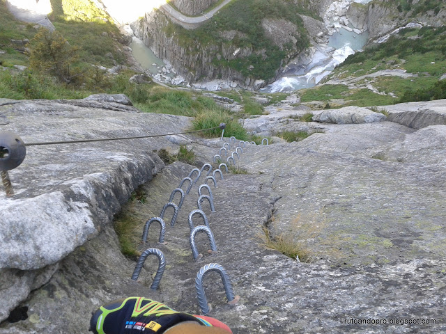 Tambien tenemos la ferrata Diabolo. A Marga no le apetece subir la ferrata pero yo ni me lo pienso, en un momento estoy preparado y empezando a subir, sin tener muy claro por donde se baja, lo unico que se es que no es rapelando. La ferrata es bastante fácil, sin ningún paso extraplomado, y en pocos puntos tiene sensación de altura, aunque eso no quite que por su longitud te haga sudar de lo lindo.