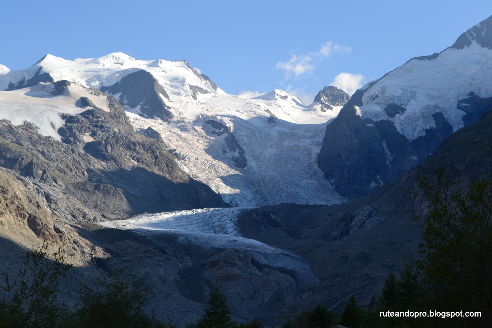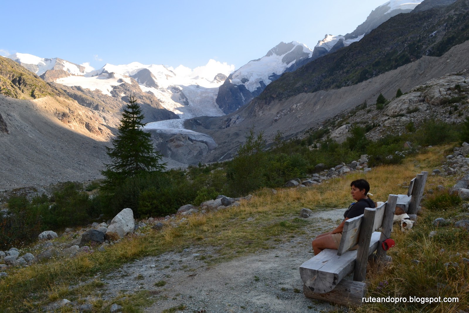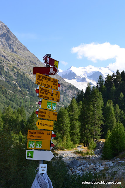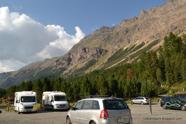 Nuestra idea era quedarnos en uno de los camping de la zona, pero no nos gustaron mucho, eran pequeños y estaban a tope, muy agobiantes. Seguimos ruta dirección paso de Bernina, pero antes paramos para ver el Glaciar de Morteratsch, nos desviamos durante 1 km mas o menos para llegar a un parking de pago, de donde sale la ruta. No puedo decir cuanto costaba porque los hicimos los suecos y no pagamos.