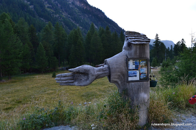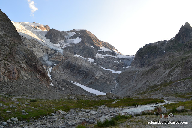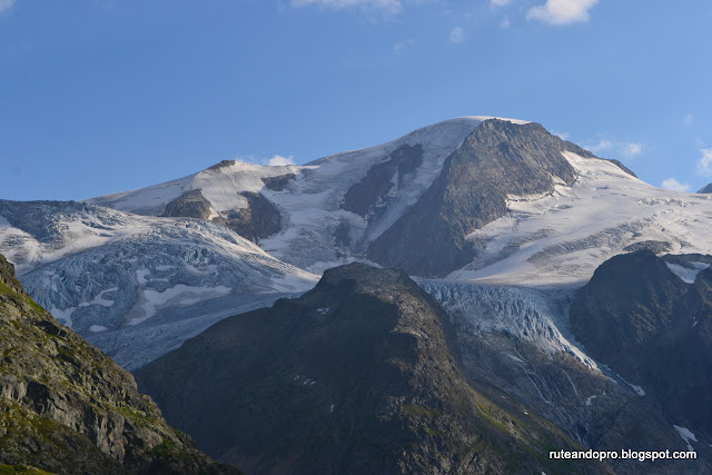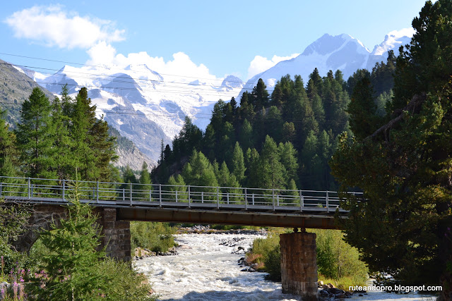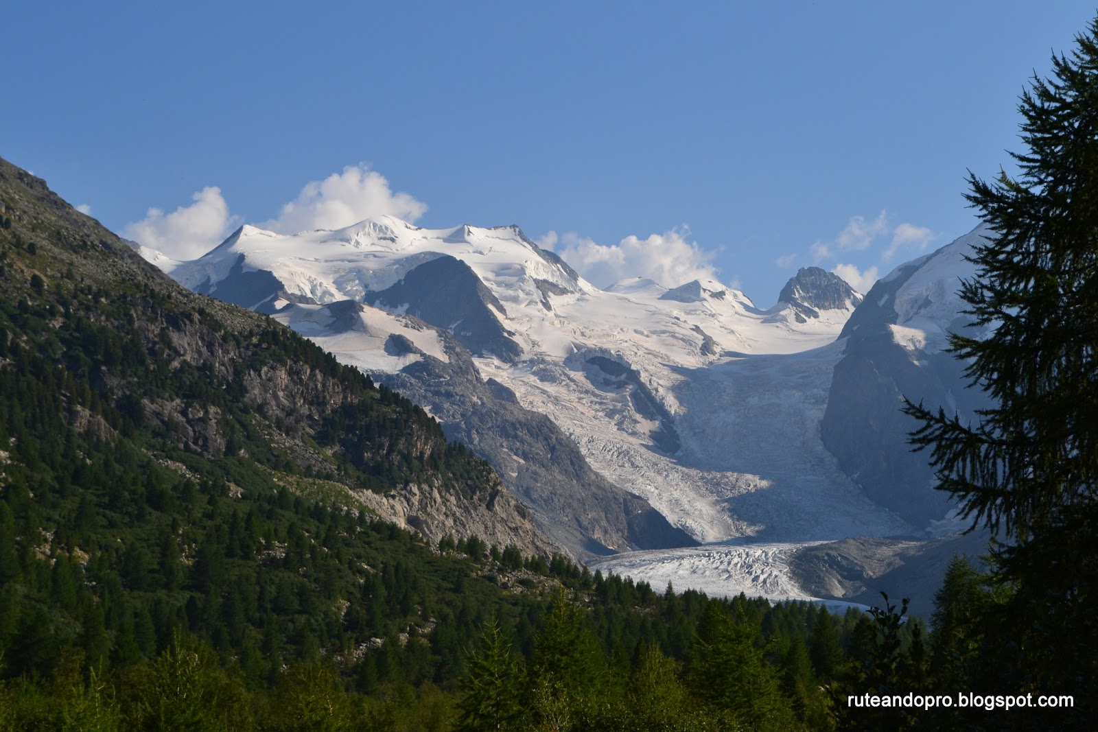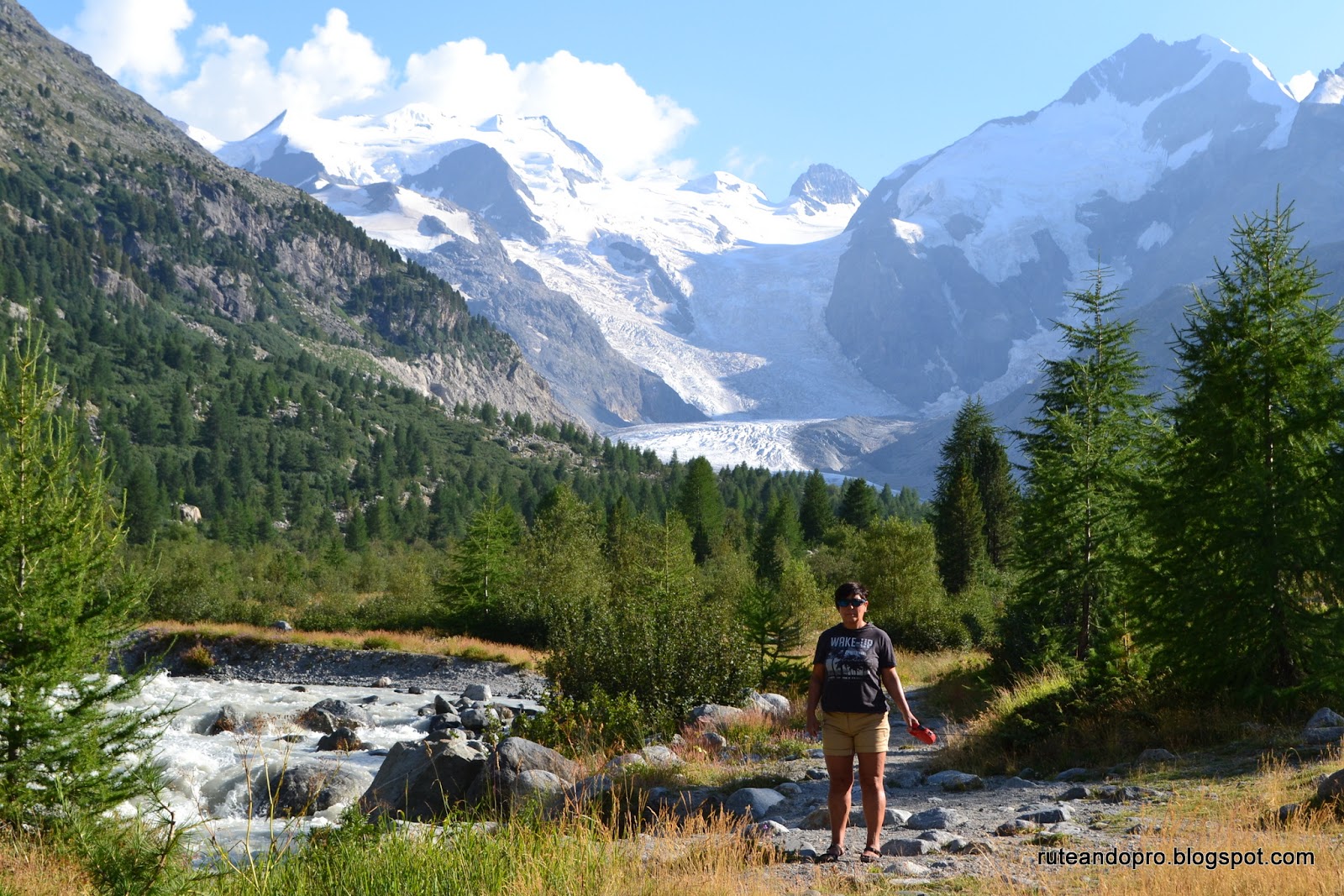 Nuestra idea era quedarnos en uno de los camping de la zona, pero no nos gustaron mucho, eran pequeños y estaban a tope, muy agobiantes. Seguimos ruta dirección paso de Bernina, pero antes paramos para ver el Glaciar de Morteratsch, nos desviamos durante 1 km mas o menos para llegar a un parking de pago, de donde sale la ruta. No puedo decir cuanto costaba porque los hicimos los suecos y no pagamos.