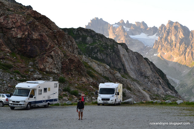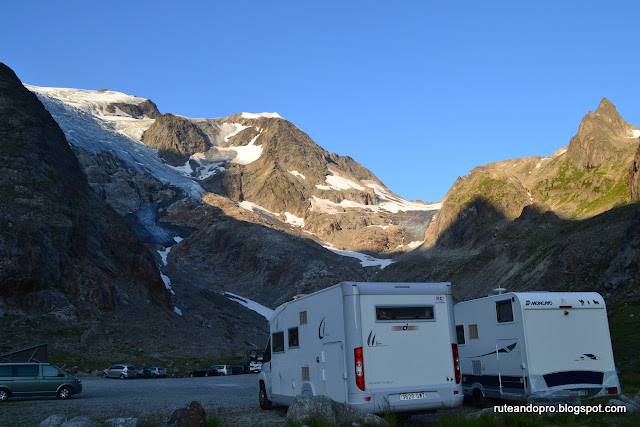 Al fondo de valle, por la carretera que habíamos subido, vemos que hay una carretera que se adentra dirección a los glaciares, no podemos dejar la ocasión de recorrer una carretera tan pintoresca, en el mapa que tenemos no bien señalada. Bajamos parte del puerto y nos adentramos en la carretera no nos dimos cuenta pero al entrar hay una cabina para sacar el tiket, por lo visto vale 6 €. Esta noche la pasaremos en el parking mas alto de la carretera, frete a los glaciares.