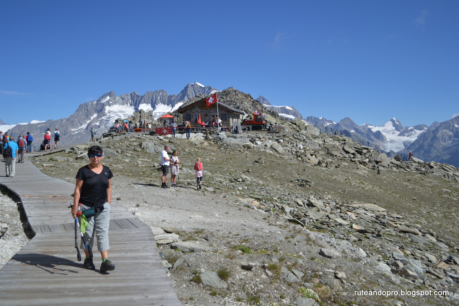Hemos pagado la subida de hasta Eggishorn pero la bajada desde Fiescheralp. El precio esta vez ha sido 87 € y urko ha pagado la mitad del billete. Desde la estación de Eggishorn subimos al pico del mismo nombre con una altura de 2926 m. por un camino de piedra bastante asequible para todos.