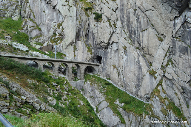 El sitio donde hemos dormido ha sido espectacular, pero las rutas que hay son por los glaciares y no estamos preparados para ellas, seguimos ruta dirección Andermatt, para ello subimos los que nos queda del Sustempass y los bajamos dirección Wassen para continuar por la nacional hasta Andermatt, pero un poco antes de llegar nos paramos en un parking en la carretera para visitar las Herzlich willkommen, que es un sendero muy corto , pasa un túnel y tienes una vistas privilegiadas de las cascadas.