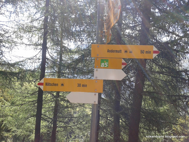 Para bajar, sigo el único sendero que hay y al poco tiempo me encentro con indicaciones de varias rutas entre ellas la de bajada hasta Andermatt en 50 minutos. El descenso es rápido por un sendero muy bien marcado y sin problema de perdida. Al llegar unos 500 metros y llego a la ac.