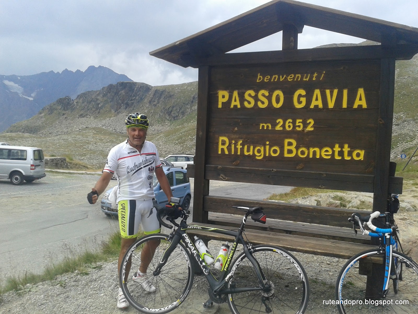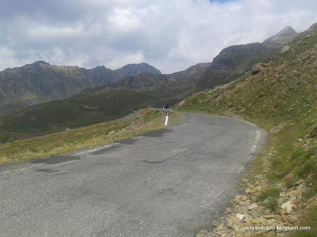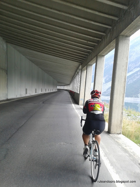 La subida al Gavia al principio es suave, voy calentando poco a poco hasta que en el km 3 empieza rampas del 7 y 8 % que nos pondrá el corazon y las piernas calentidos, practicamente los porcentajes no varian hasta llegar al km 7 donde empiezan a sucederse rampas entre el 13 y el 14 % llegando en algunos momentos al 18 % una barbaridad, así estaré hasta el km 10. A partir del km 10 las rampas se suaviza hasta el 10 % hasta que llegamos al tunel en el km 14, este tunel es estresante tiene unos 500 metros en curva muy poco iluminado y en subida con una pendiente de 13%, entre que nos ves nada, los coches que pasan muy cerca y la pendiente, cuando sales del tunel tienes el corazón en la boca, pero a partir de aquí solo quedan 3 km ya de rampas mas suaves, resumiento un puerto de 17 km con 1430 metros desnivel. Al llegar arriba el día de oscurece , el sol desaparece y el frío se apodera de todos los ciclistas que han osado a subir en el día de hoy. Lo primero al llegar arriba es abrigarse, la foto de rigor, comer y beber. Ahora lo que toca es bajar los 17 km de puerto hasta llegar de nuevo a Ponte di Legno para subir directamente hasta el Paso de Tonale. Este puerto tiene 10 km y 600 metros de desnivel con rampas mas suaves que el puerto del Gavia pero se hacen pesadas tras las fuerte subida anterior, en el puerto de Tonale las rampas no superan en 8 %.
